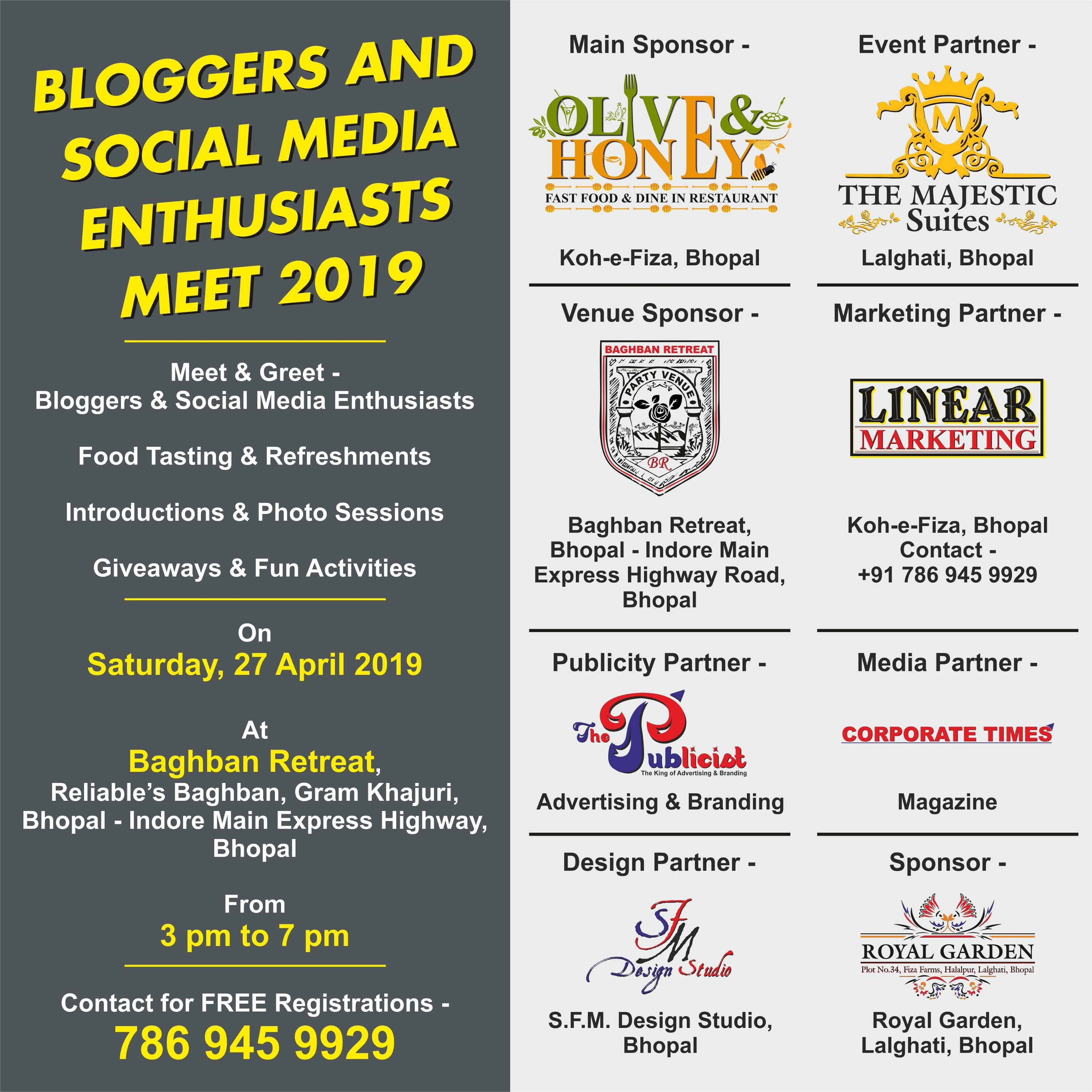 Register now by sending message on 7869459929 for #Bloggers and #Social #Media #Enthusiasts Meet at Reliable #Baghban Retreat, Gram Khajuri, Bhopal – Indore Main Express Highway Road, Bhopal on Saturday, 27 April 2019 from 3 pm to 7 pm. Meet and Greet Bloggers and Social Media Enthusiasts, #Food #Tasting, Refreshments, Introductions, #Photo Sessions, #Giveaways & Fun Activities. Contact Now. #awesome #event