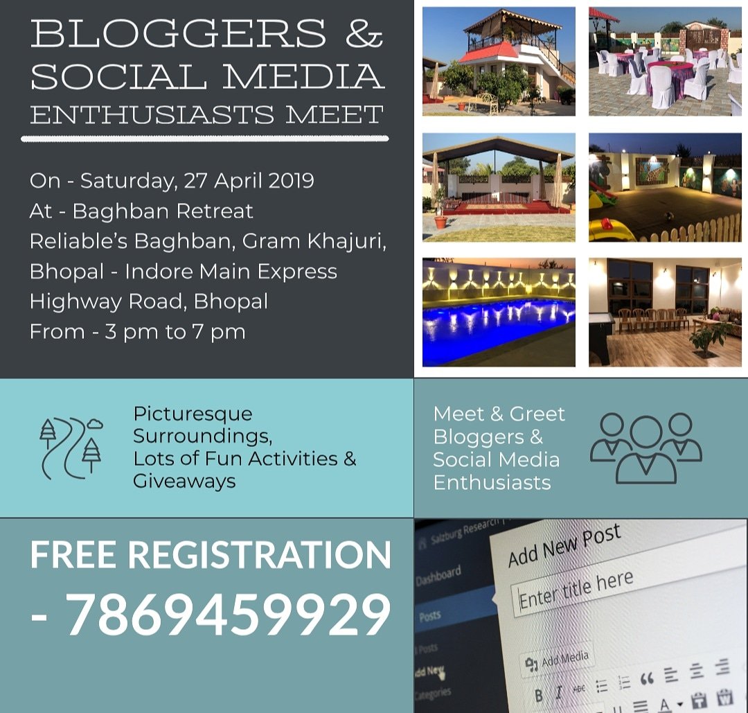 Are you Ready for the #Meet & #Greet Social High Tea Programme of #Bloggers and #Social #Media #Enthusiasts – 27 April 2019 – #event at Baghban Retreat from 3 pm to 7 pm with lots of #fun #activities and #giveaways – #register now – SMS or call 7869459929 #bloggermeet #Bhopal #awesome