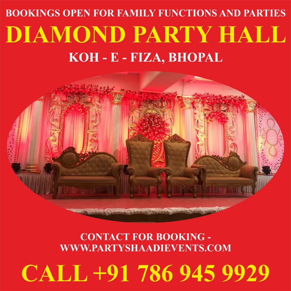 Bookings Open for Family Functions and Parties at Diamond Party Hall, Koh-e-Fiza, Bhopal. Contact Party Shaadi Events – Call +917869459929