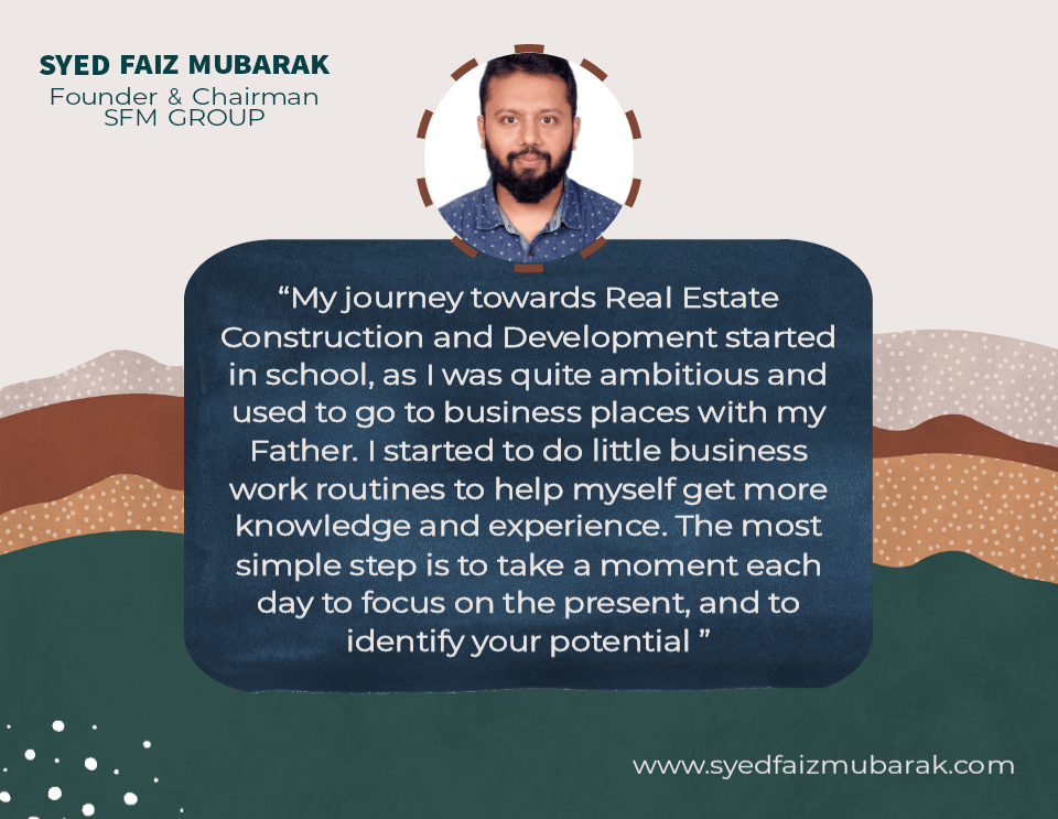 “My journey towards Real Estate Construction and Development started in School, as I was quite ambitious and used to go to business places with my Father. I started to do little business work routines to help myself get more knowledge and experience. The most simple step is to take a moment each day to focus on the present, and to identify your potential”