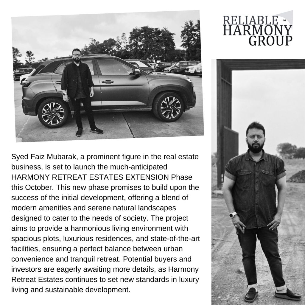 Syed Faiz Mubarak, a prominent figure in the real estate business, is set to launch the much-anticipated HARMONY RETREAT ESTATES EXTENSION Phase this October. This new phase promises to build upon the success of the initial development, offering a blend of modern amenities and serene natural landscapes designed to cater to the needs of society. The project aims to provide a harmonious living environment with spacious plots, luxurious residences, and state-of-the-art facilities, ensuring a perfect balance between urban convenience and tranquil retreat. Potential buyers and investors are eagerly awaiting more dete Retreat Estates continues to set new sta living and sustainable development.